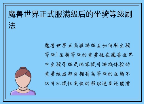 在魔兽世界中,坐骑等级是玩家提升游戏体验的重要组成部分。拥有高等级的坐骑不仅可以提供更快的移动速度,还能增加玩家的战斗力和形象魅力。玩家在满级后刷坐骑等级成为了许多玩家的目标之一。